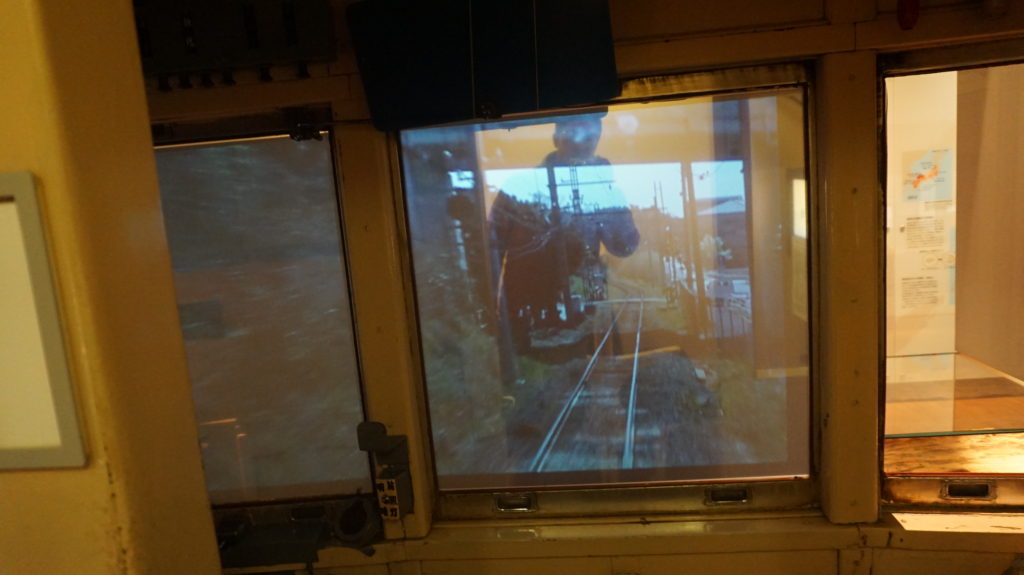 車内へと足を踏み入れると、前方にはかつて走った車窓がそのまま映し出されていた。外で流れていたもの同じかどうかは分からないが、実際に電車が動いているように感じることができた。