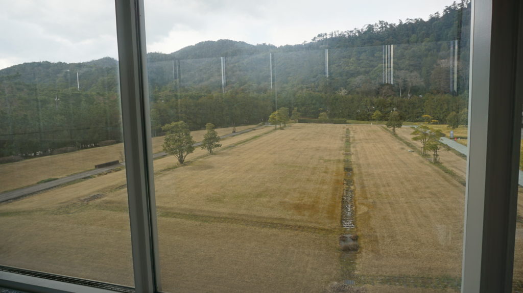 そして3Fから見た外の景色。一面草のようなものが広がっていて、奥には連なる木々が見渡せる。晴れていれば澄み渡る景色になっていたかもしれない。