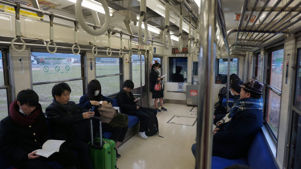 車内はこんな感じ。さっきの川跡駅はかなり混んでいたのに、車内は意外にも空席があった。