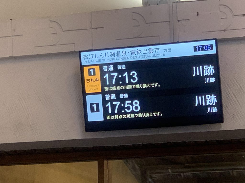 川跡駅で「電鉄出雲市行き」に乗り換えて、最終的に出雲市駅に着くのは17:36。