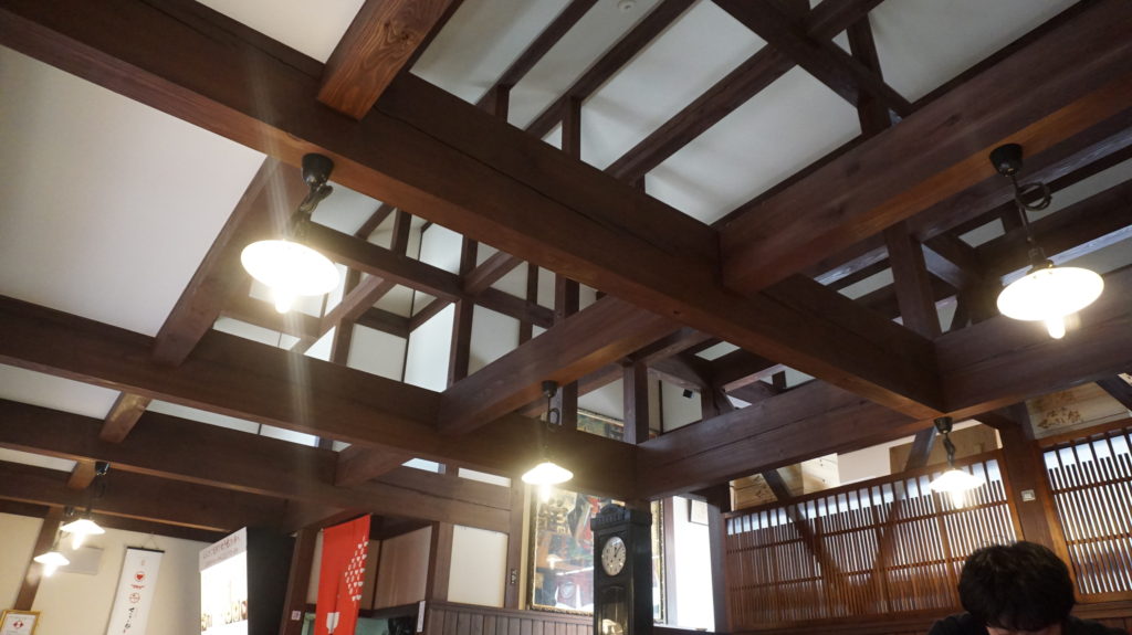 ぜんざいが来るのを待っている間にふと見上げると、梁がめぐらされているのがわかる。
